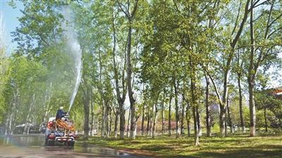 昨日,在奥森公园北园,园林工人在清洗车的水箱中注入了今年首次研发投用的“凝絮剂”,随后开启高压水枪对杨树进行喷洒。