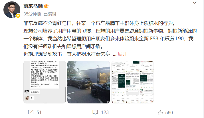 8月7日,上海蔚来汽车有限公司品牌与传播助理副总裁马麟发文称:“非常反感不分青红皂白,往某一个汽车品牌车主群体身上泼脏水的行为。理想公司培养了用户用电的习惯,理想的用户更是愿意拥抱新事物、拥抱新能源的一个群体。我当然也希望理想用户朋友们多来体验蔚来全新ES8和乐道L90,我们没有任何动机去和理想用户闹矛盾。近期理想受到攻击,有人把祸水往蔚来身上引,如果理想用户朋友们信以为真,那就正中攻击者下怀了,请理想用户朋友们擦亮眼睛,避免被利用。我观察到近期的一些舆情,有直接攻击,有祸水东引,有借刀杀人,有转移视线。对于从行业层面消除这种攻击,我没有任何幻想,遇到了怎么办?我觉得沈斐的建议特别好,请理想公司真正通过法律途径解决问题,尽快报警。”