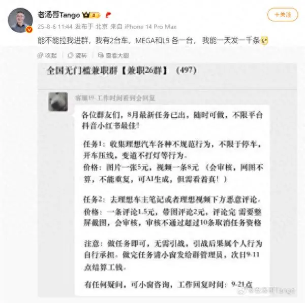 前一日(8月6日),理想汽车产品负责人老汤哥Tango甩出聊天截图,截图显示群里明码标价:收集理想车主停车压线、变道不打灯等不规范行为,一张图片给5元,一段视频能赚8元;到理想车主的笔记或相关视频下恶意评论,文字评论1.5元一条,带图评论则涨到2元。